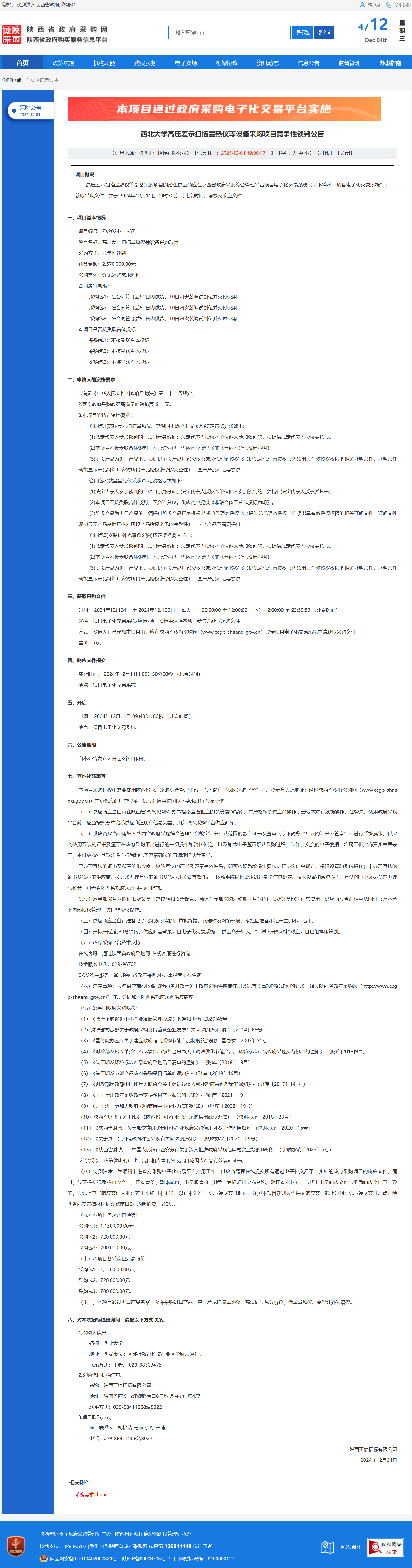 乐鱼网页版页面登录高压差示扫描量热仪等设备采购项目竞争性谈判公告 作者:采购与招标办公室 编辑: 时间:2024-12-04 原公告链接:https://www.ccgp-shaanxi.gov.cn/freecms/site/shaanxi/ggxx/info/2024/8a69c5a59218576d0193913c35b35476.html?noticeType=001013¬iceId=9d4d6b86-b230-11ef-8063-08c0eb20c666