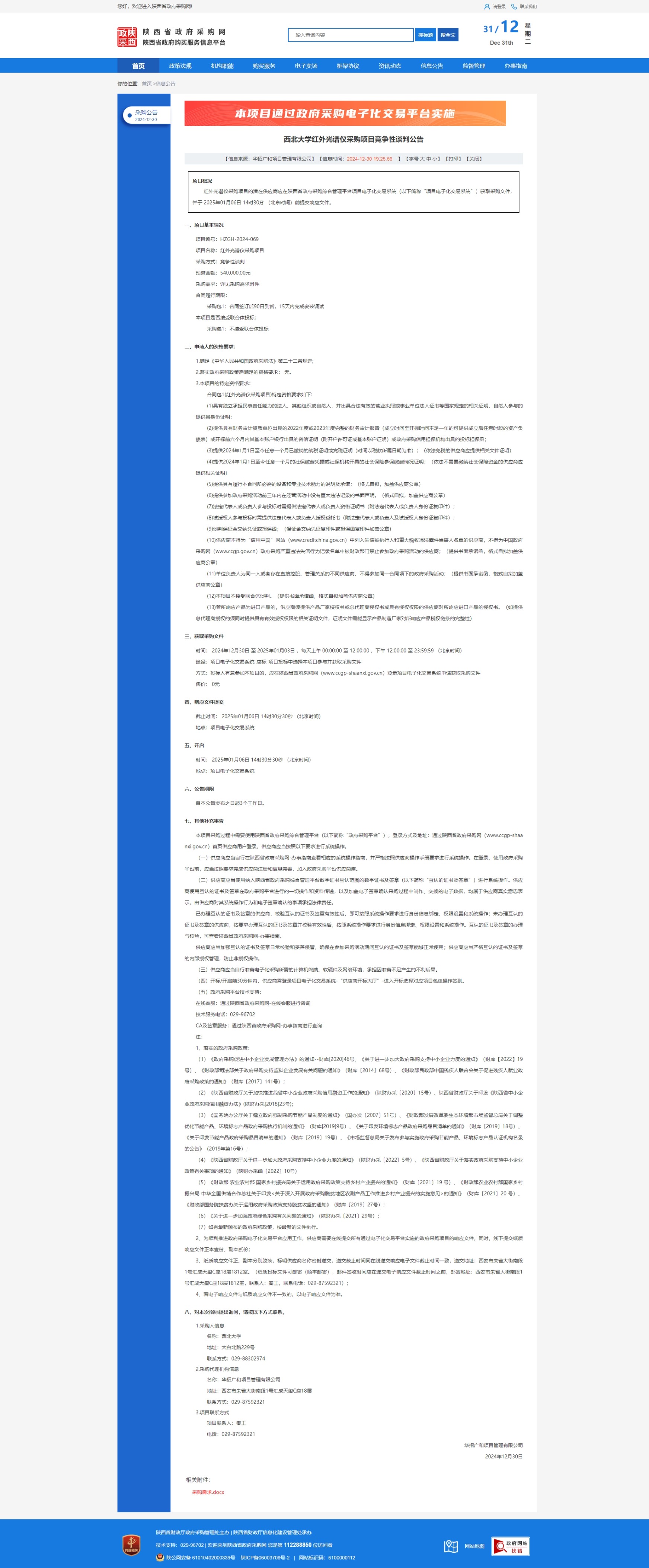 乐鱼网页版页面登录红外光谱仪采购项目竞争性谈判公告 作者: 编辑:薛利娟 时间:2024-12-31 原公告链接:https://www.ccgp-shaanxi.gov.cn/freecms/site/shaanxi/ggxx/info/2024/8a69c251921857370194174168cb49b9.html?noticeType=001013¬iceId=7e09294d-c6a2-11ef-8063-08c0eb20c666