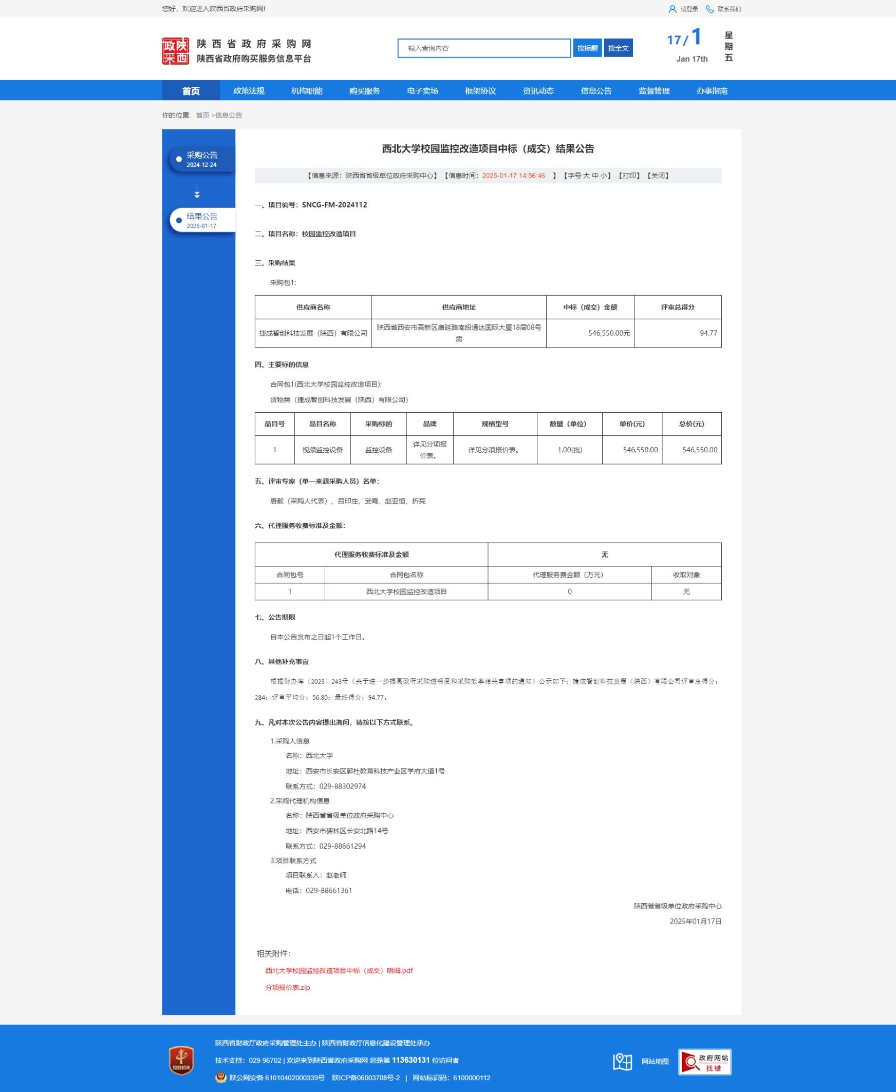 乐鱼网页版页面登录校园监控改造项目中标(成交)结果公告 作者: 编辑:薛利娟 时间:2025-01-17 原公告链接:https://www.ccgp-shaanxi.gov.cn/freecms/site/shaanxi/ggxx/info/2025/8a69c46994554cc2019471c2fbea2f8d.html?noticeType=001021¬iceId=e7f16300-d4a1-11ef-8063-08c0eb20c666