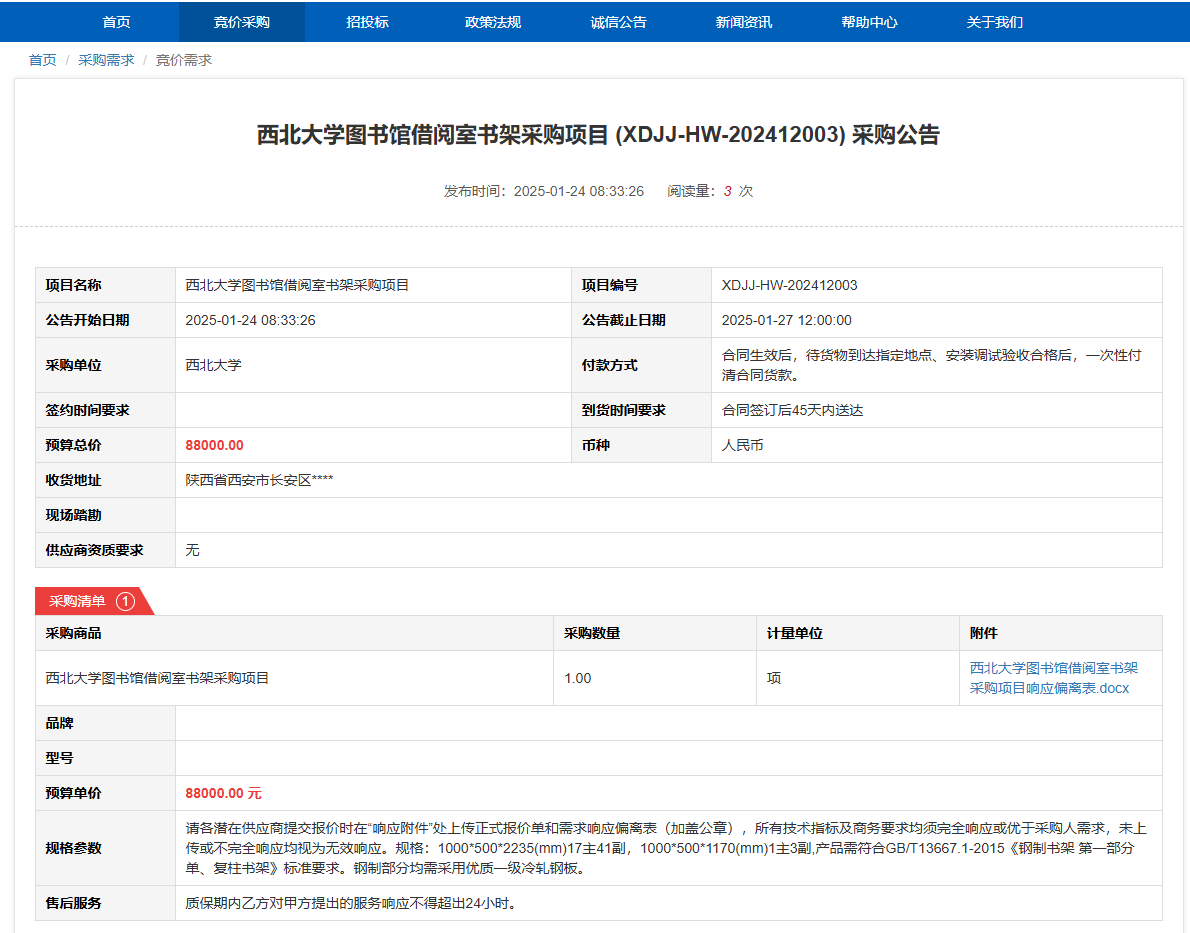 乐鱼网页版页面登录图书馆借阅室书架采购项目 (XDJJ-HW-202412003) 采购公告 作者:采购与招标办公室 编辑: 时间:2025-01-24 原公告链接:https://www.ejingcai.com.cn/site/bidding/detail/16453