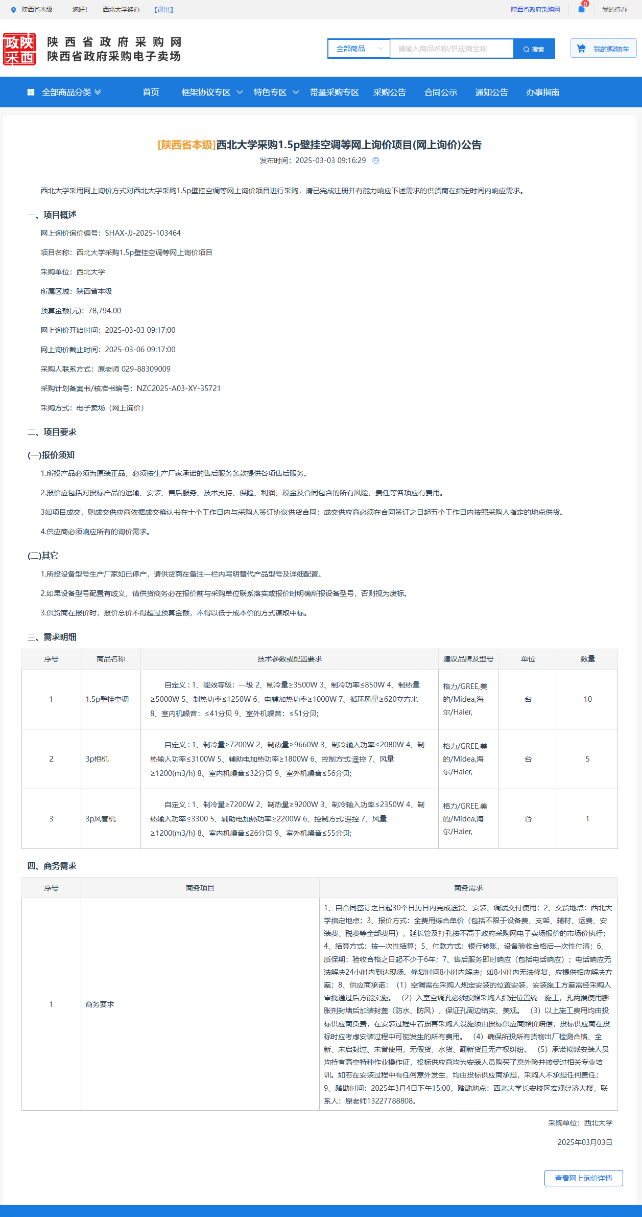 乐鱼网页版页面登录采购1.5p壁挂空调等网上询价项目(网上询价)公告