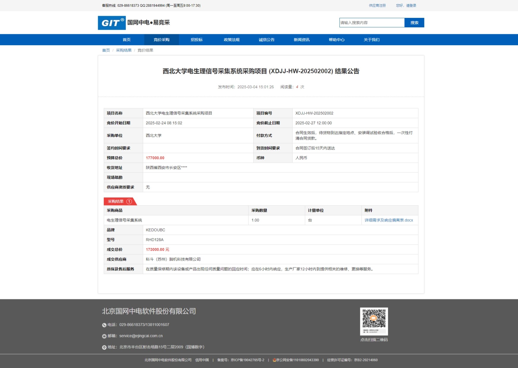 乐鱼网页版页面登录电生理信号采集系统采购项目 (XDJJ-HW-202502002) 竞价结果公告 作者: 编辑:采购与招标办公室 时间:2025-03-04 原公告链接:https://www.ejingcai.com.cn/site/bidding/detail/16713