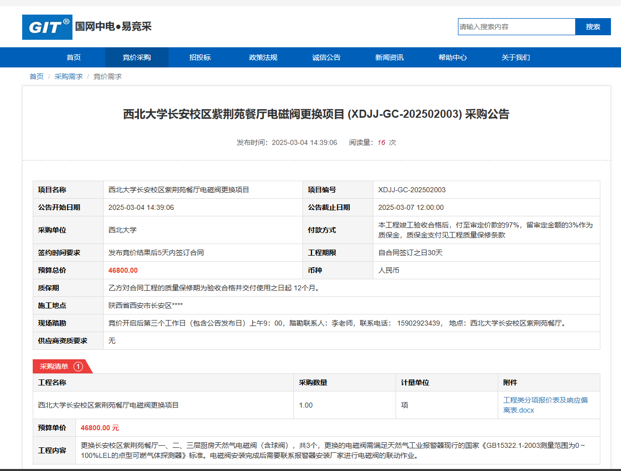 乐鱼网页版页面登录长安校区紫荆苑餐厅电磁阀更换项目(XDJJ-GC-202502003)竞价采购公告 作者:采购与招标办公室 编辑: 时间:2025-03-04 原公告链接:https://www.ejingcai.com.cn/site/bidding/detail/16712