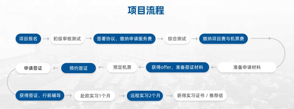 实习机构的匹配及安置(包括前期联络、背景审核、落实实习细节、最终确认)、学生能力综合评估(包括初级审核测试和综合测试)、实习申请服务(包括资料整理、审核、修改等)、境外住宿费、场地和交流活动费用、境外保险、因实习产生的境外交通费签证辅导及预约、出行前培训、项目期间综合管理等。