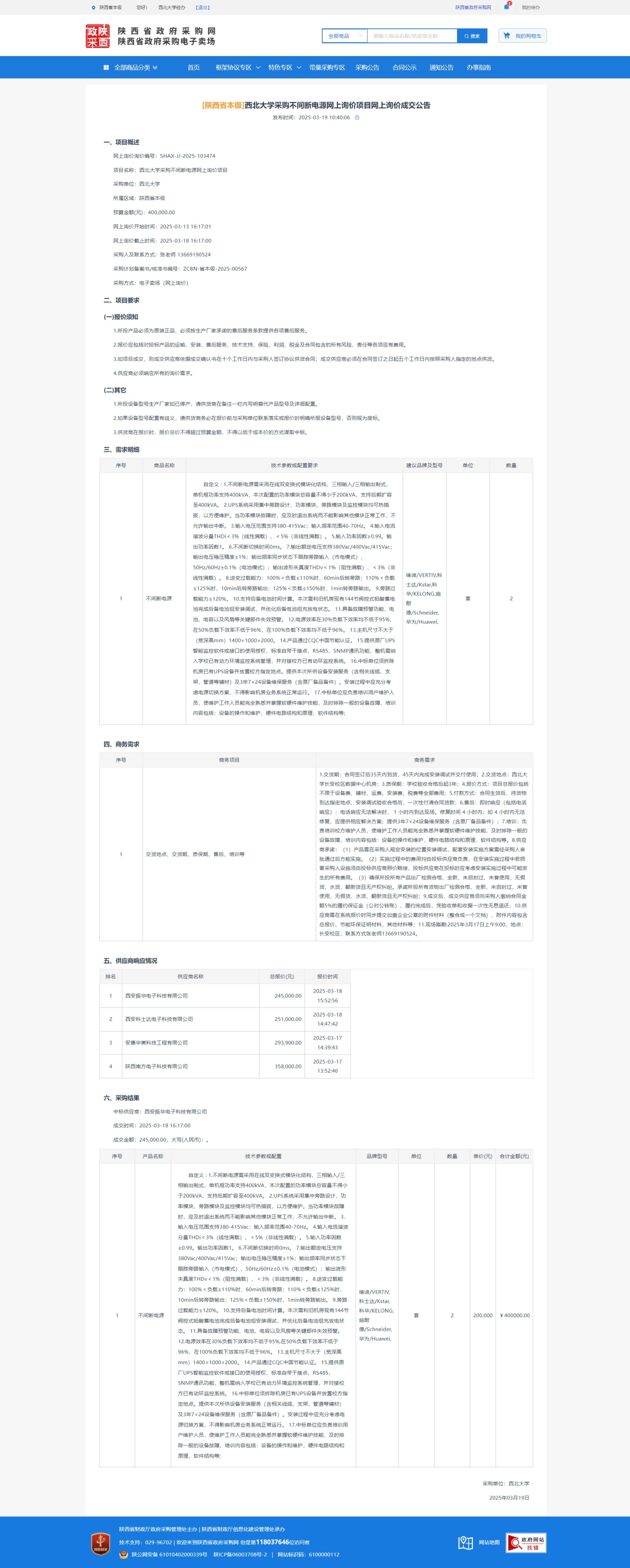 乐鱼网页版页面登录采购不间断电源网上询价项目网上询价成交公告 作者: 编辑:采购与招标办公室 时间:2025-03-19 原公告链接:https://www.ccgp-shaanxi.gov.cn/gpmall-main-web/basic/noticeDetail?noticeGuid=7301336059869331456