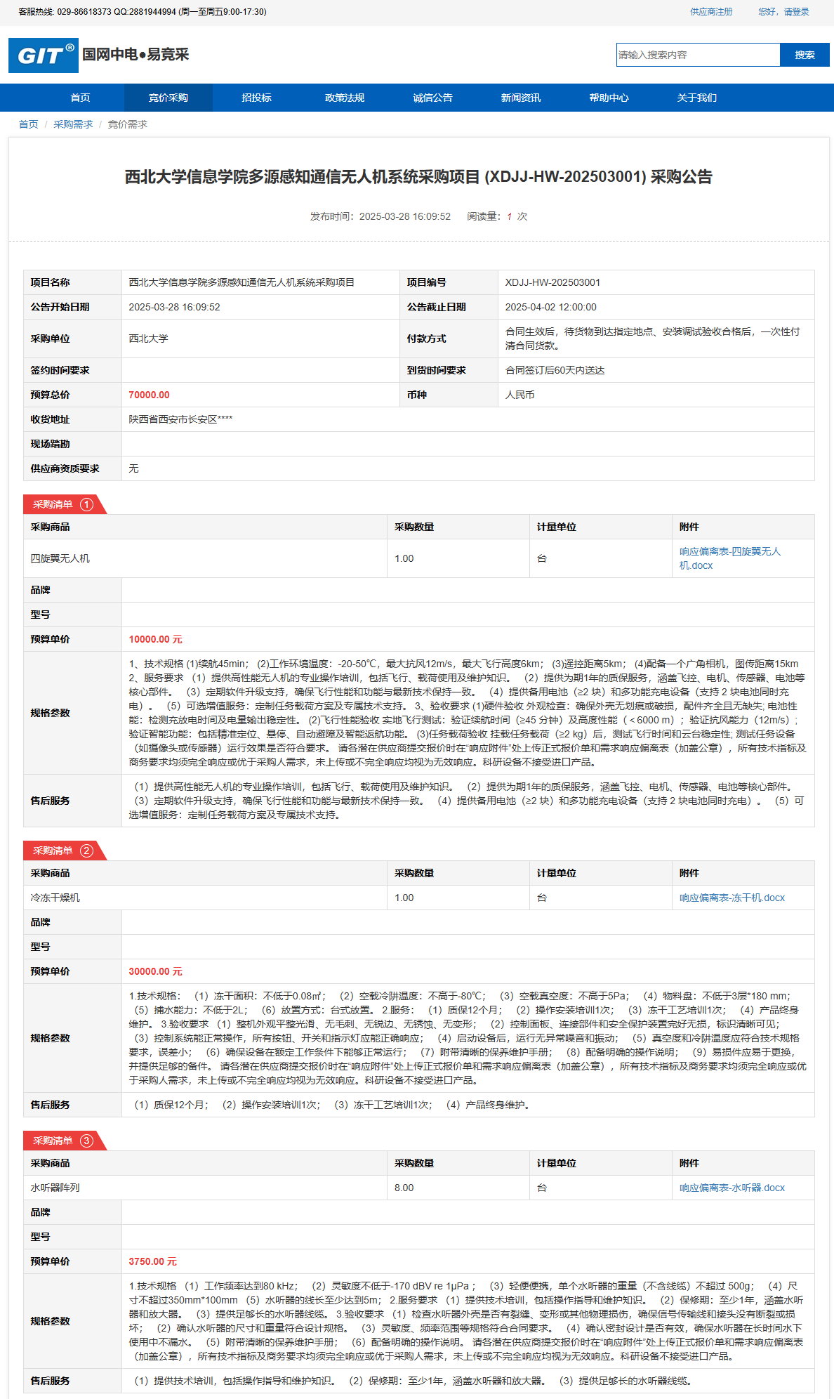 乐鱼网页版页面登录信息学院多源感知通信无人机系统采购项目(XDJJ-HW-202503001)竞价采购公告 作者:采购与招标办公室 编辑: 时间:2025-03-28 原公告链接:https://www.ejingcai.com.cn/site/bidding/detail/17255
