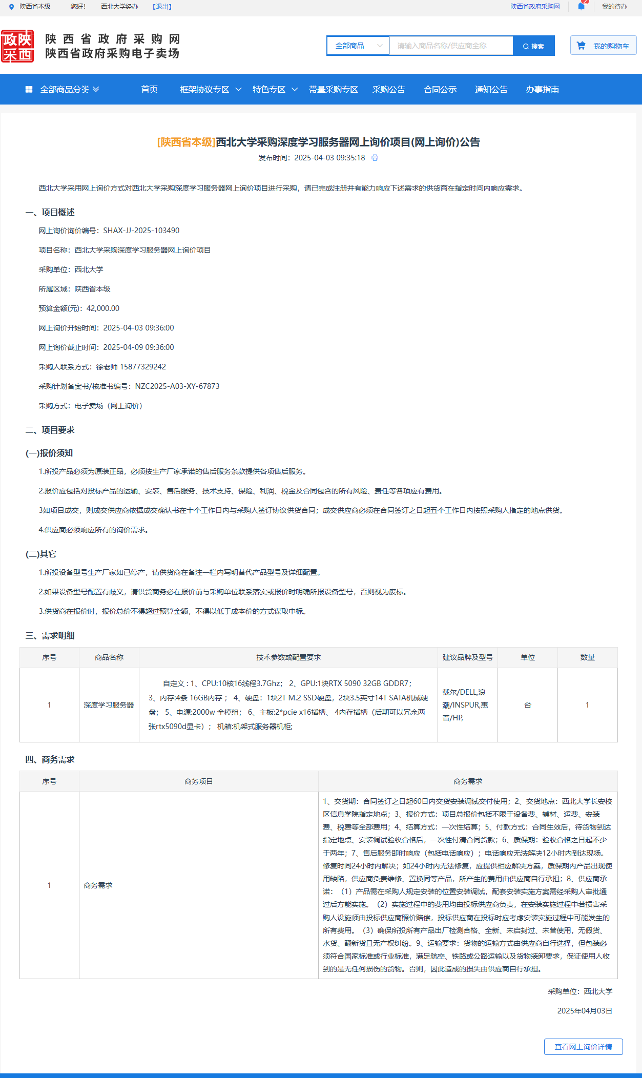 乐鱼网页版页面登录采购深度学习服务器网上询价项目(网上询价)公告 作者:采购与招标办公室 编辑: 时间:2025-04-03 原公告链接:https://www.ccgp-shaanxi.gov.cn/gpmall-main-web/basic/noticeDetail?noticeGuid=7306755570823004160