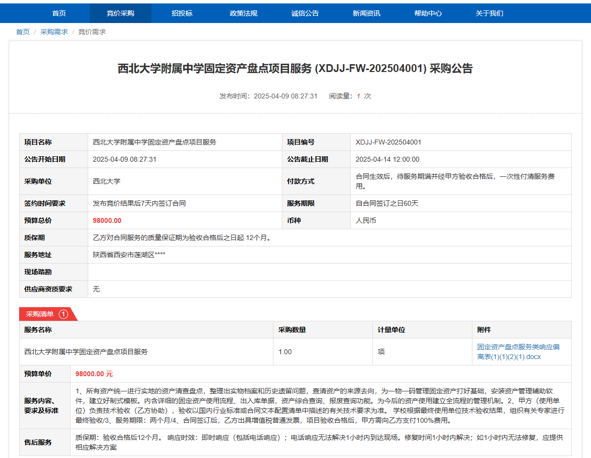乐鱼网页版页面登录附属中学固定资产盘点项目服务(XDJJ-FW-202504001)竞价采购公告 作者:采购与招标办公室 编辑: 时间:2025-04-09 原公告链接:https://www.ejingcai.com.cn/site/bidding/detail/17501