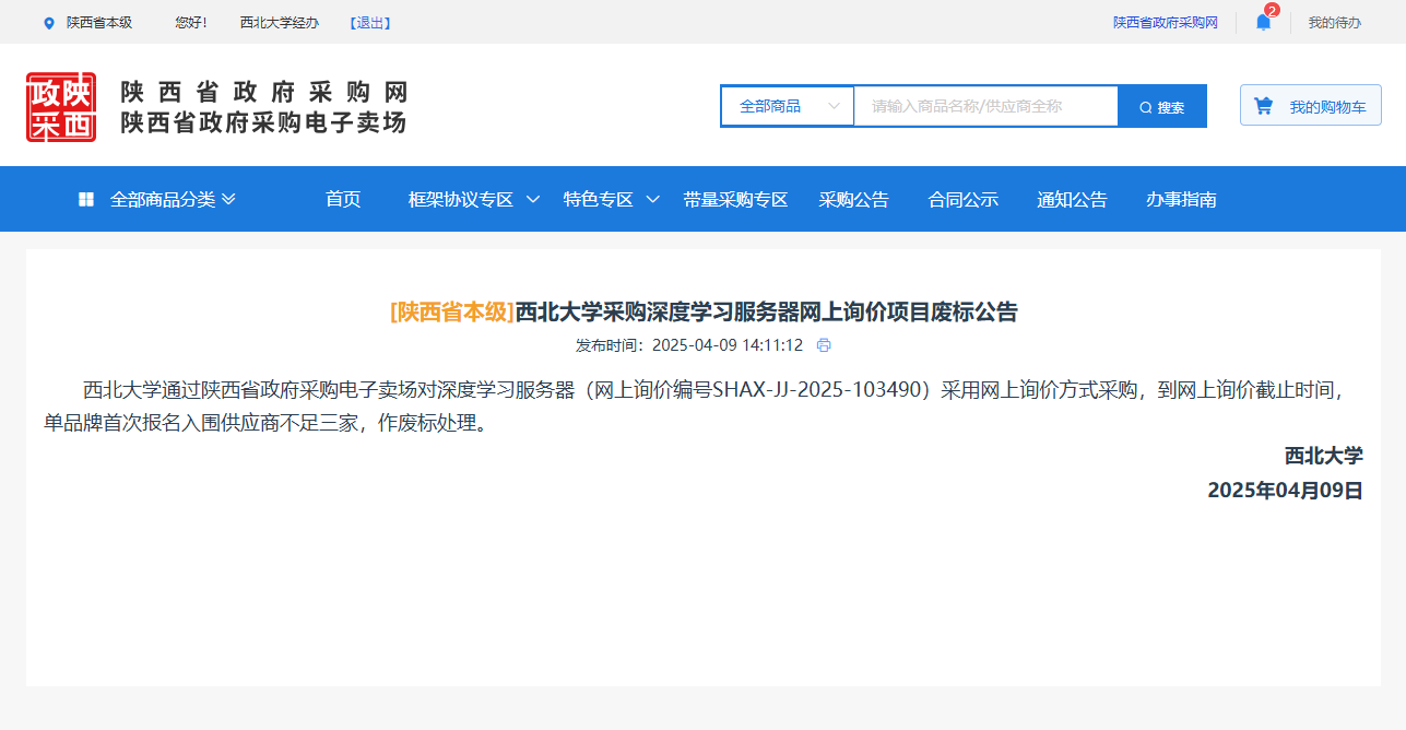 乐鱼网页版页面登录采购深度学习服务器网上询价项目废标公告 作者:采购与招标办公室 编辑: 时间:2025-04-09 原公告链接:https://www.ccgp-shaanxi.gov.cn/gpmall-main-web/basic/noticeDetail?noticeGuid=7308999329707130880