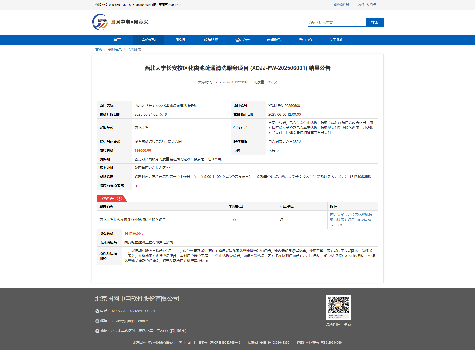 乐鱼网页版页面登录长安校区化粪池疏通清洗服务项目 (XDJJ-FW-202506001) 结果公告