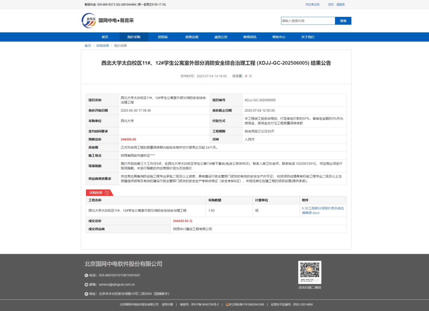 乐鱼网页版页面登录太白校区11#、12#学生公寓室外部分消防安全综合治理工程 (XDJJ-GC-202506005) 结果公告 作者: 编辑:采购与招标办公室 时间:2025-07-04 原公告链接:https://www.ejingcai.com.cn/site/bidding/detail/19344