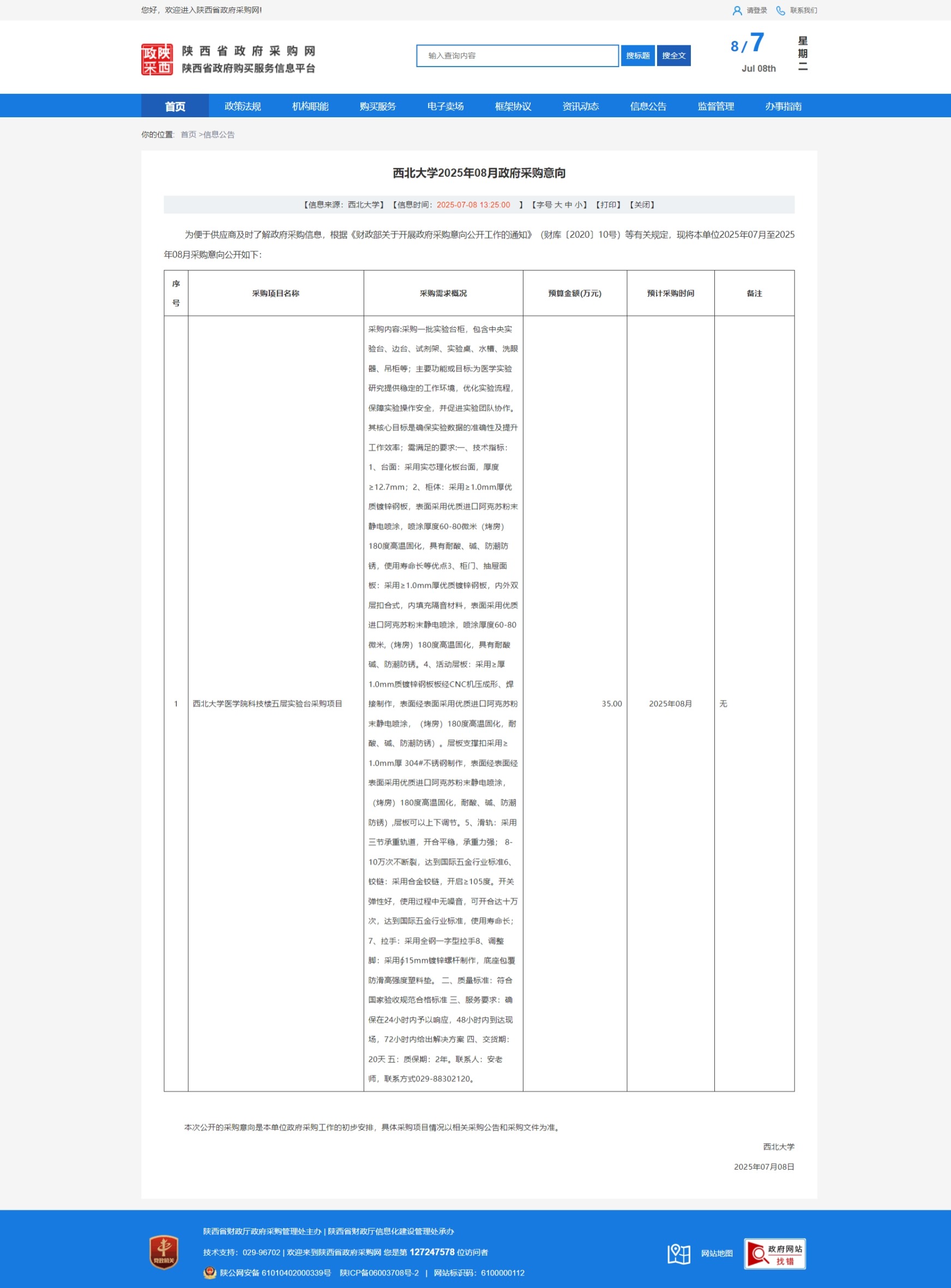 乐鱼网页版页面登录2025年08月政府采购意向 作者: 编辑:采购与招标办公室 时间:2025-07-08 原公告链接:https://www.ccgp-shaanxi.gov.cn/freecms/site/shaanxi/ggxx/info/2025/8a69c68d97d2c4550197e87d6842455f.html?noticeType=59¬iceId=e4cb9cdd-5bbd-11f0-8063-08c0eb20c666