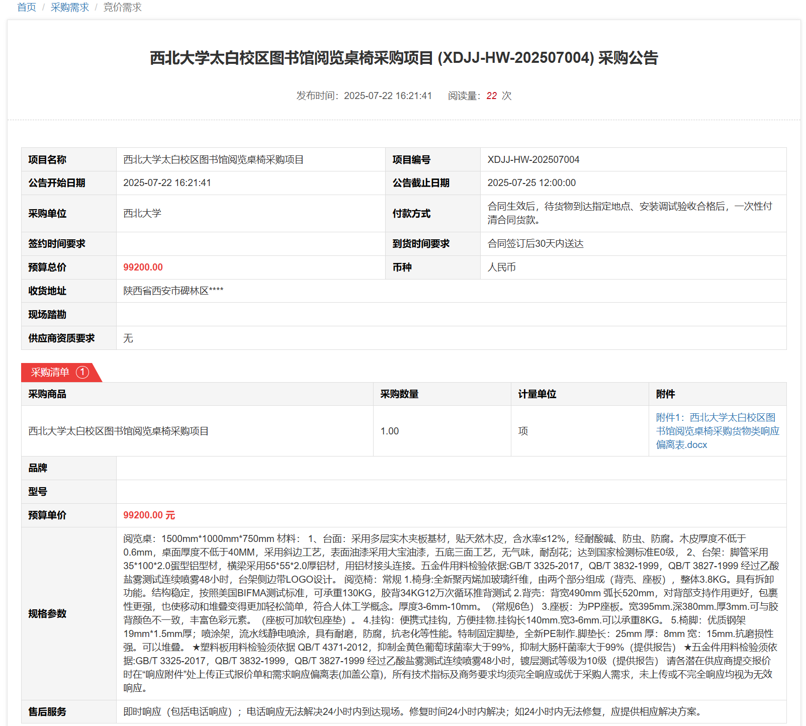 乐鱼网页版页面登录太白校区图书馆阅览桌椅采购项目(XDJJ-HW-202507004)竞价采购公告 作者:采购与招标办公室 编辑: 时间:2025-07-22 原公告链接:https://www.ejingcai.com.cn/site/bidding/detail/19667
