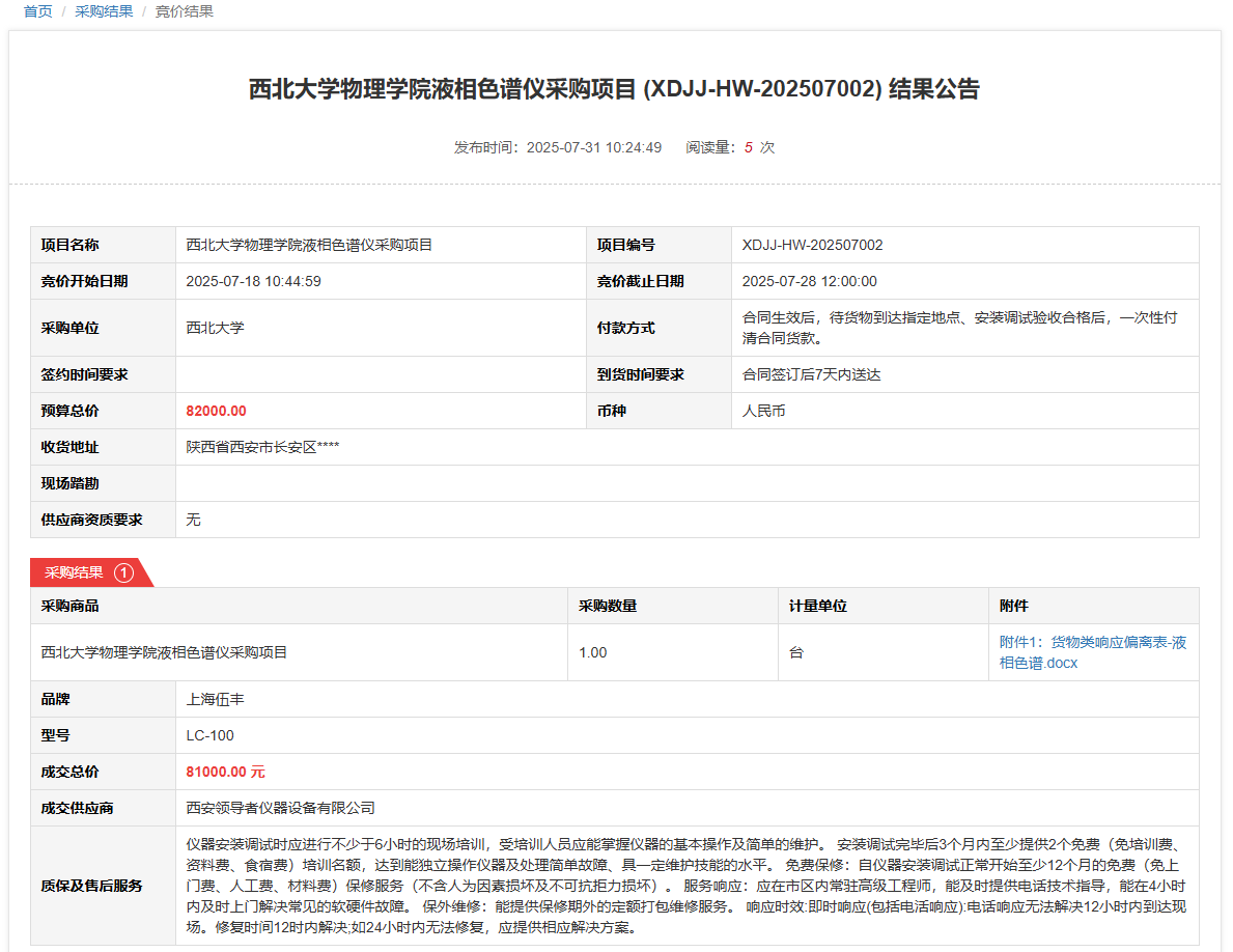 乐鱼网页版页面登录物理学院液相色谱仪采购项目(XDJJ-HW-202507002)竞价结果公告