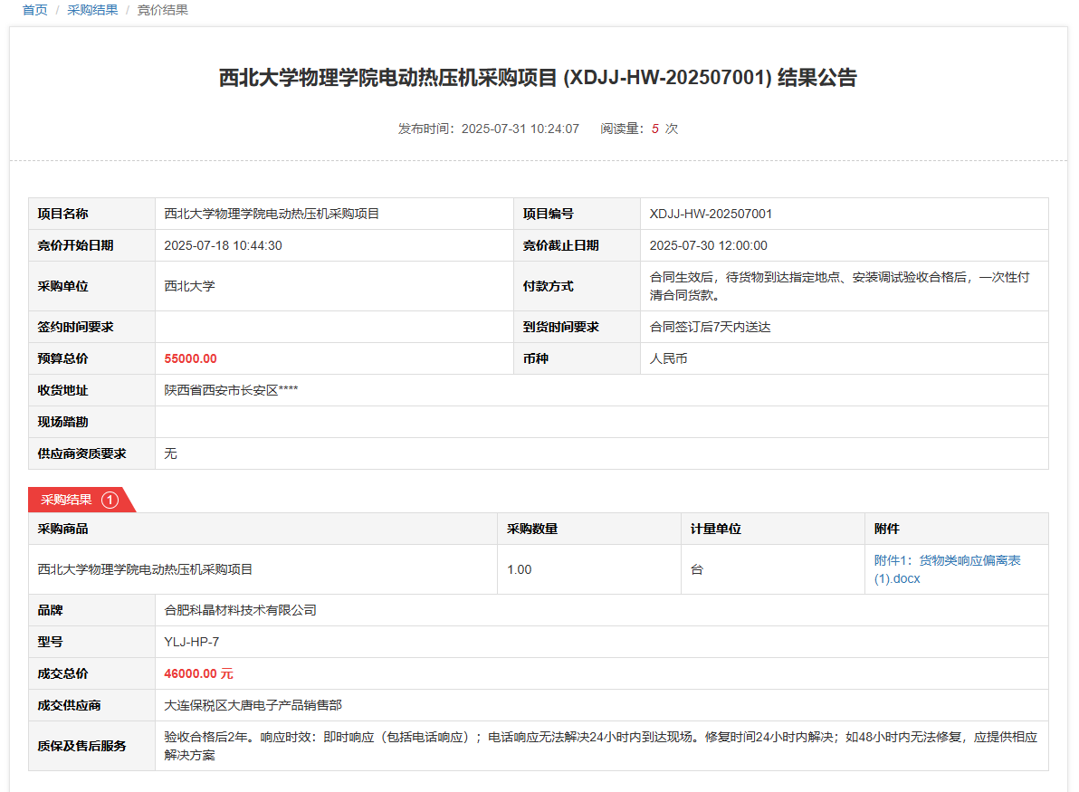 乐鱼网页版页面登录物理学院液相色谱仪采购项目(XDJJ-HW-202507002)竞价结果公告