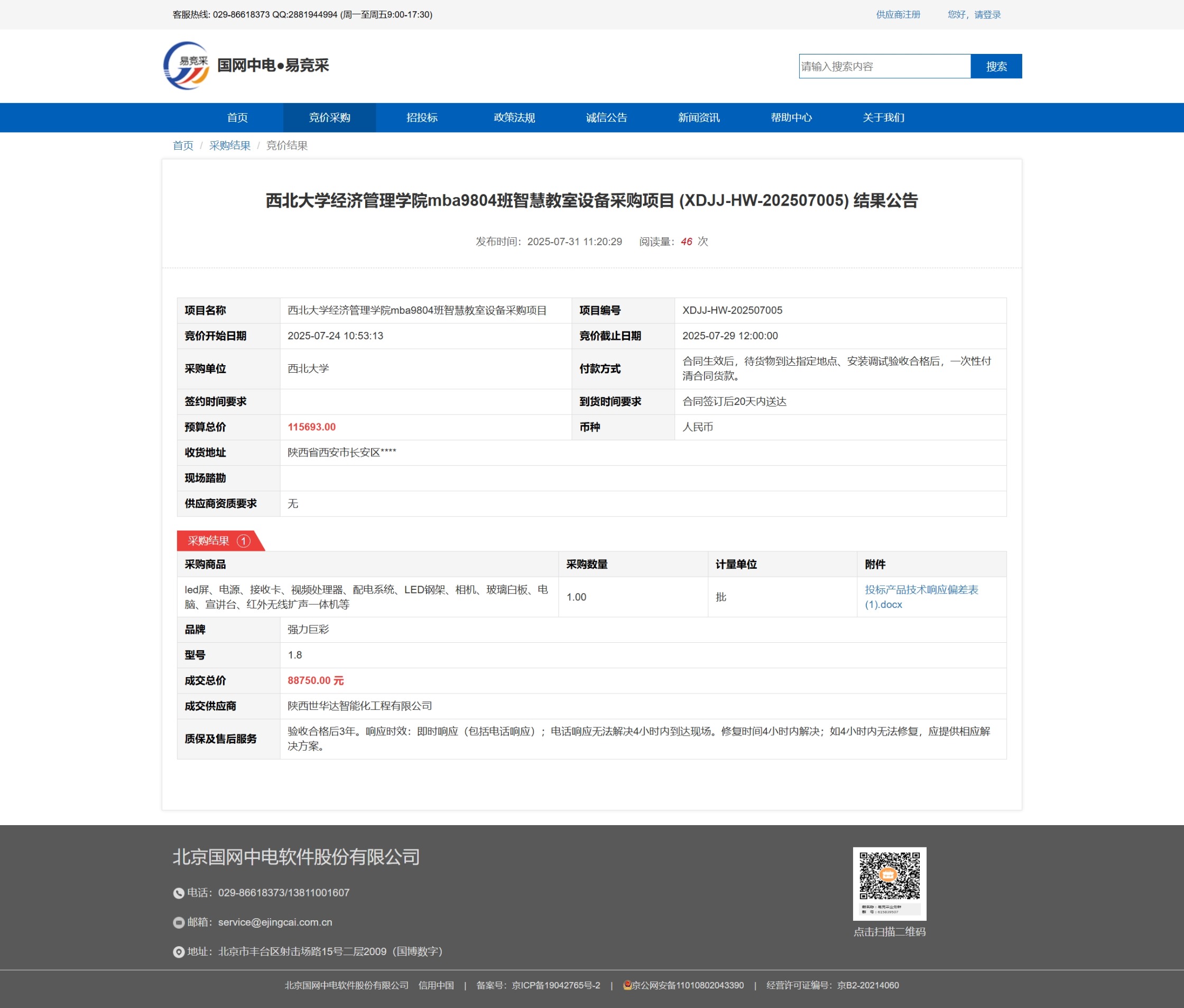 乐鱼网页版页面登录经济管理学院mba9804班智慧教室设备采购项目 (XDJJ-HW-202507005) 竞价结果公告 作者: 编辑:采购与招标办公室 时间:2025-07-31 原公告链接:https://www.ejingcai.com.cn/site/bidding/detail/19832