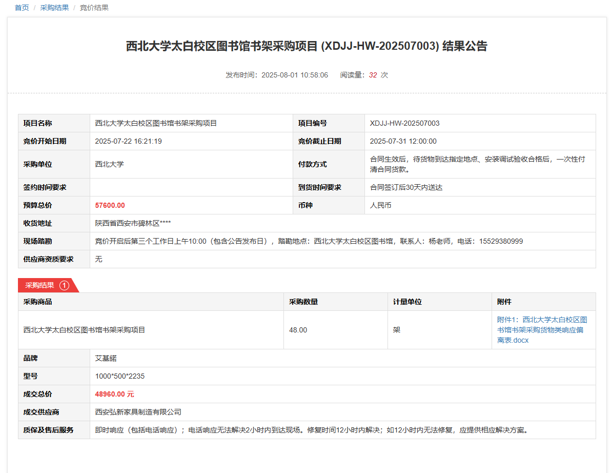 乐鱼网页版页面登录太白校区图书馆书架采购项目(XDJJ-HW-202507003)竞价结果公告