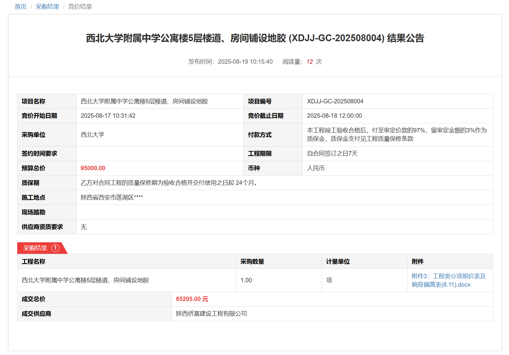 乐鱼网页版页面登录附属中学公寓楼5层楼道、房间铺设地胶(XDJJ-GC-202508004)竞价结果公告