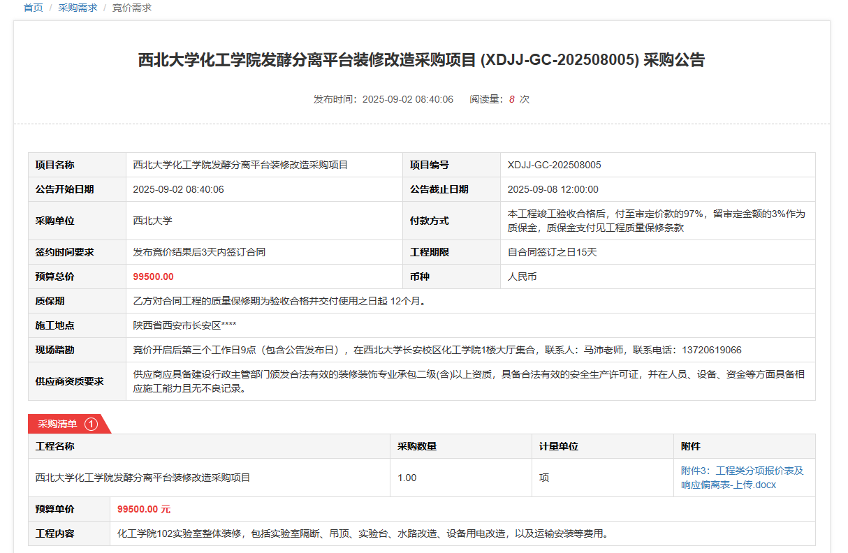 乐鱼网页版页面登录化工学院发酵分离平台装修改造采购项目(XDJJ-GC-202508005)竞价采购公告
