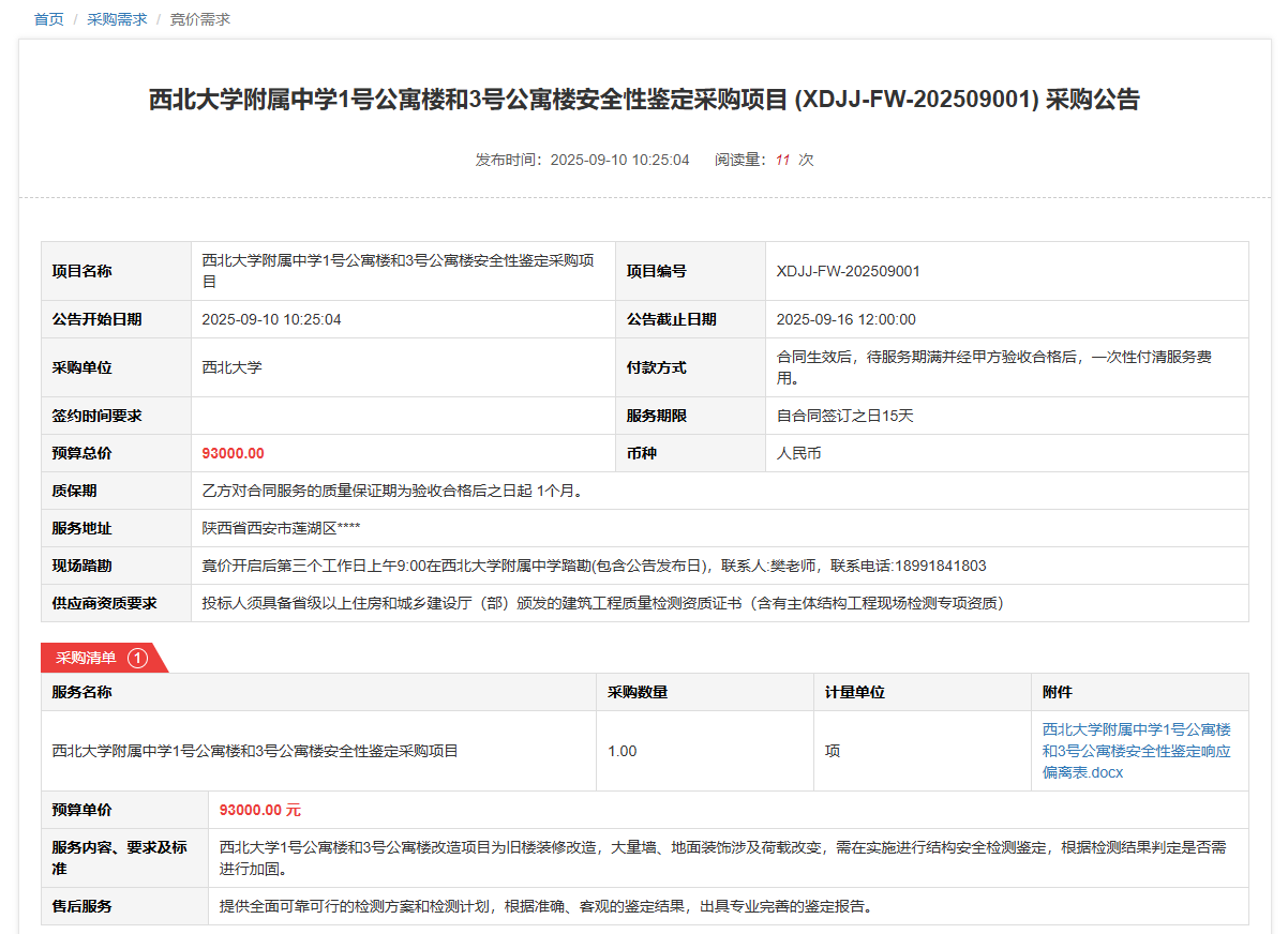 乐鱼网页版页面登录附属中学1号公寓楼和3号公寓楼安全性鉴定采购项目(XDJJ-FW-202509001)竞价采购公告