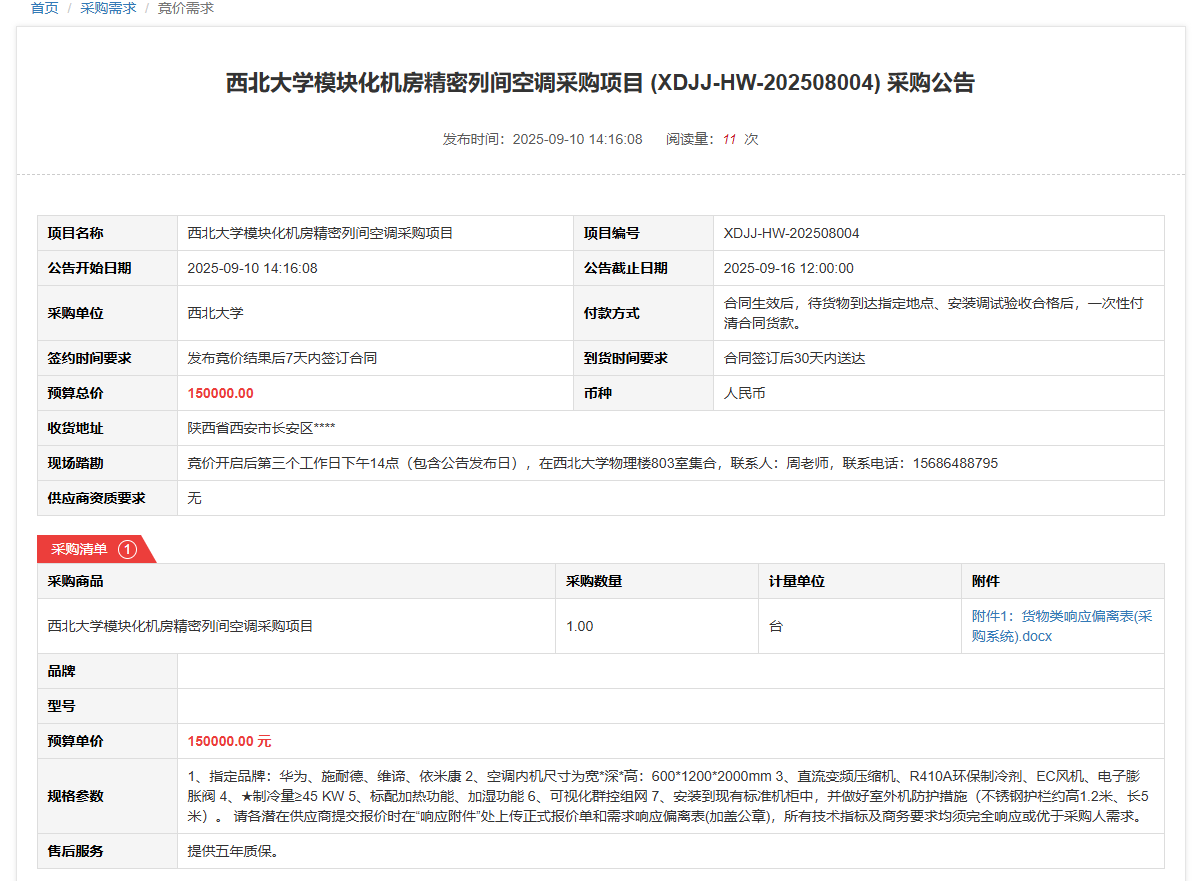 乐鱼网页版页面登录模块化机房精密列间空调采购项目(XDJJ-HW-202508004)竞价采购公告