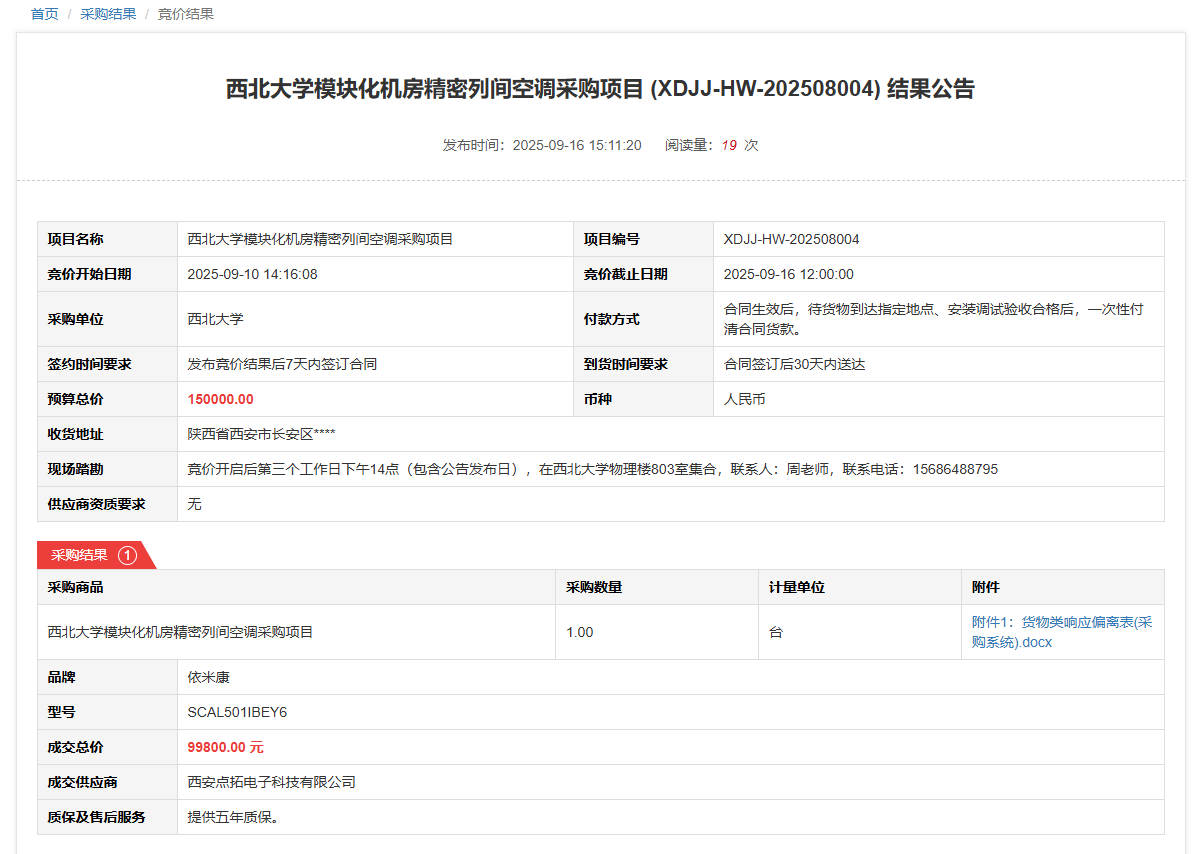 乐鱼网页版页面登录模块化机房精密列间空调采购项目(XDJJ-HW-202508004)竞价结果公告
