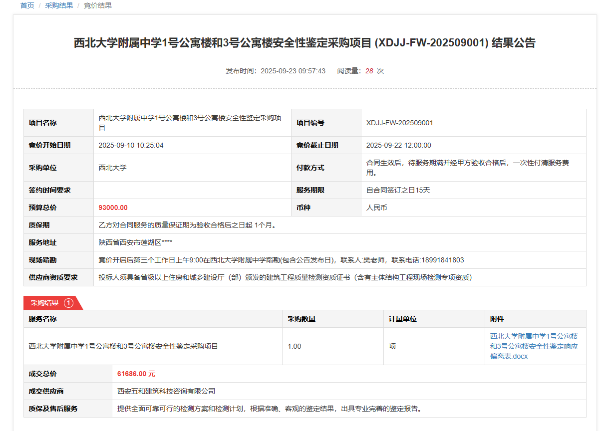 乐鱼网页版页面登录附属中学1号公寓楼和3号公寓楼安全性鉴定采购项目(XDJJ-FW-202509001)竞价结果公告