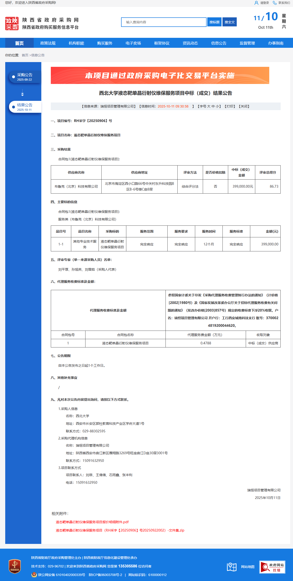 乐鱼网页版页面登录液态靶单晶衍射仪维保服务项目中标(成交)结果公告