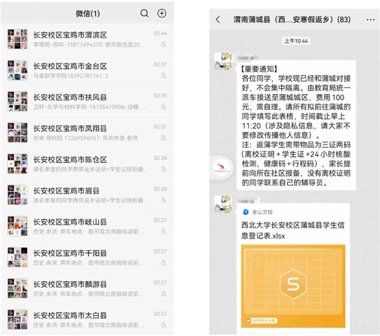 在陕西省内各市县区返乡工作微信群,联络员们第一时间为意愿返回当地的学子,传达返乡政策,提供包车车辆地点、集合时间等信息。