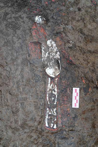 在M90大墓发现了一块用来占卜的动物肩胛骨,这块卜骨已不完整,上面发现刻有文字,有学者考释可能为甲骨文的“隹是”两字。“原来可能是一句话,但现在只能看到这两个字。在古代特别是商代和西周时期,能出土甲骨文的遗址在全国可能也就不到十个,都是诸侯以上的级别。”