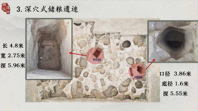 南头地点位于南城墙外侧,发现了深穴式储粮遗迹,以H154、H394为代表,两者年代为西周中期。当时的人们充分利用黄土特点,挖出了或方形或圆形的大坑,储粮窖穴开口很大,底部很小,用火把坑地烧得板结,以达到更好的防潮效果。H154应该经历过两次使用,坑挖得很深,发掘到大坑下面后,又发现了一个小坑,大坑套着小坑,后来小坑被垫平了。在被垫平的大坑内发现了陶瓮,瓮里有碳化的粟,在坑内还发现了碳化了的黍和大豆等粮食。
