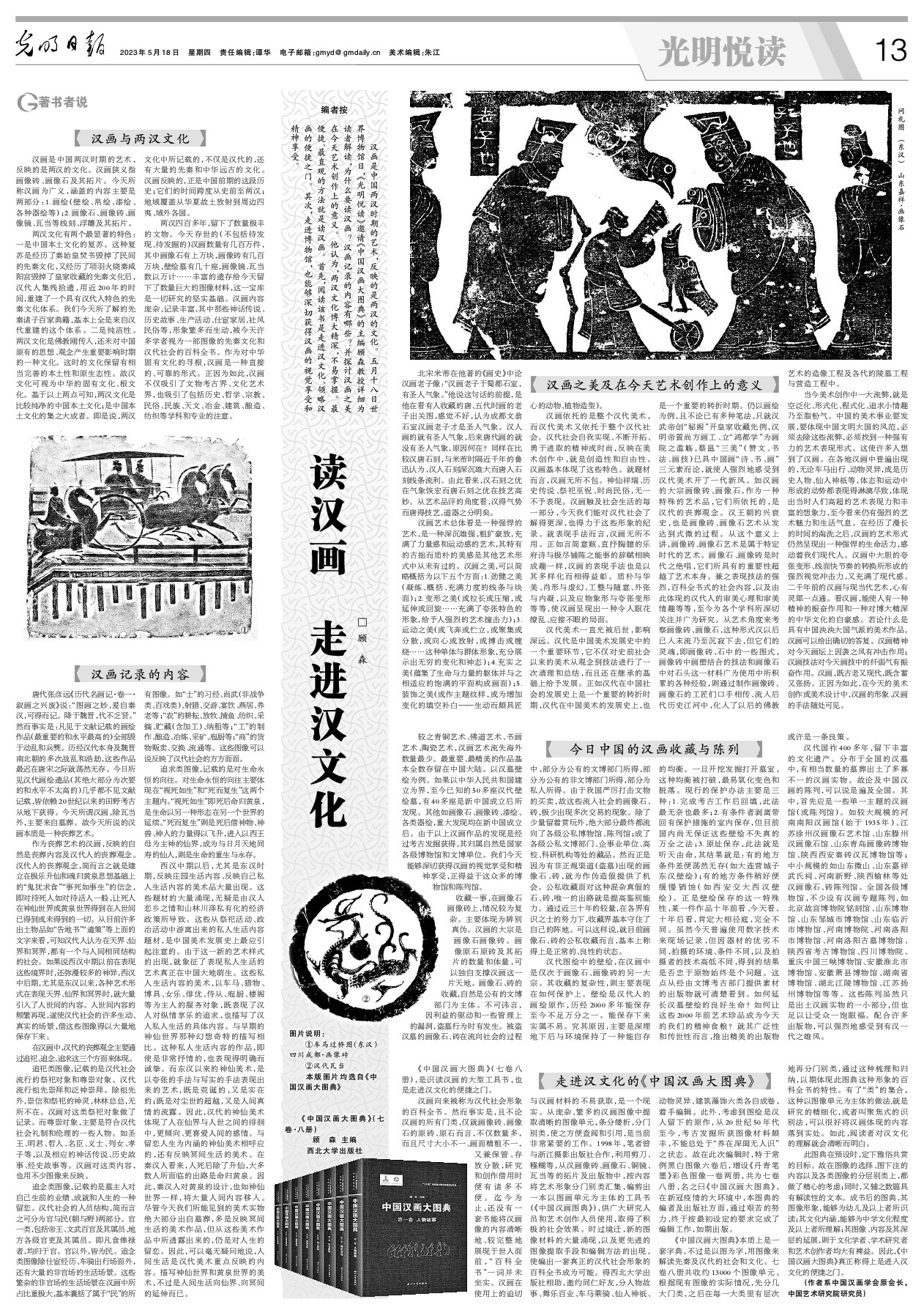 汉画是中国两汉时期的艺术,反映的是两汉的文化。5月18日世界博物馆日,《光明悦读》邀请《中国汉画大图典》的主编顾森教授详细为读者解读,为什么要读汉画?汉画记录的内容有哪些?并探讨汉画之美在今天艺术创作上的意义。他认为,两汉文化博大精深,不易掌握。最便捷、最直观的方法就是读汉画。首先,阅读该书是走进汉文化、领略汉画的便捷之门。其次,走进博物馆,也能够深切获得汉画的视觉享受和精神享受。