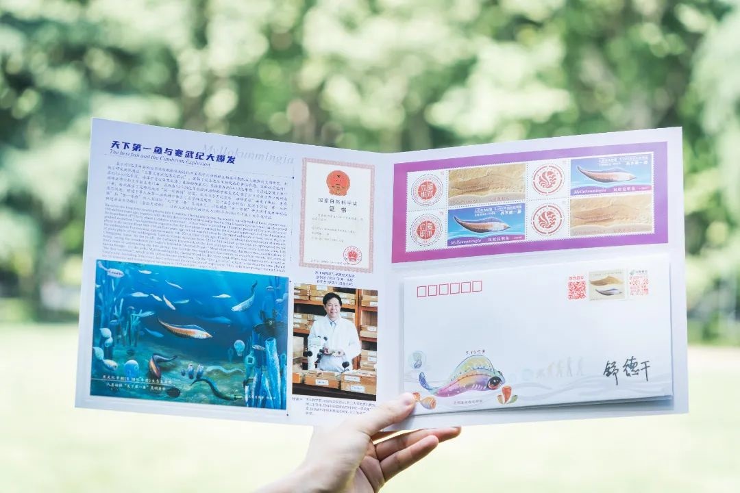 “昆明鱼化石”邮资封、明信片和邮折。