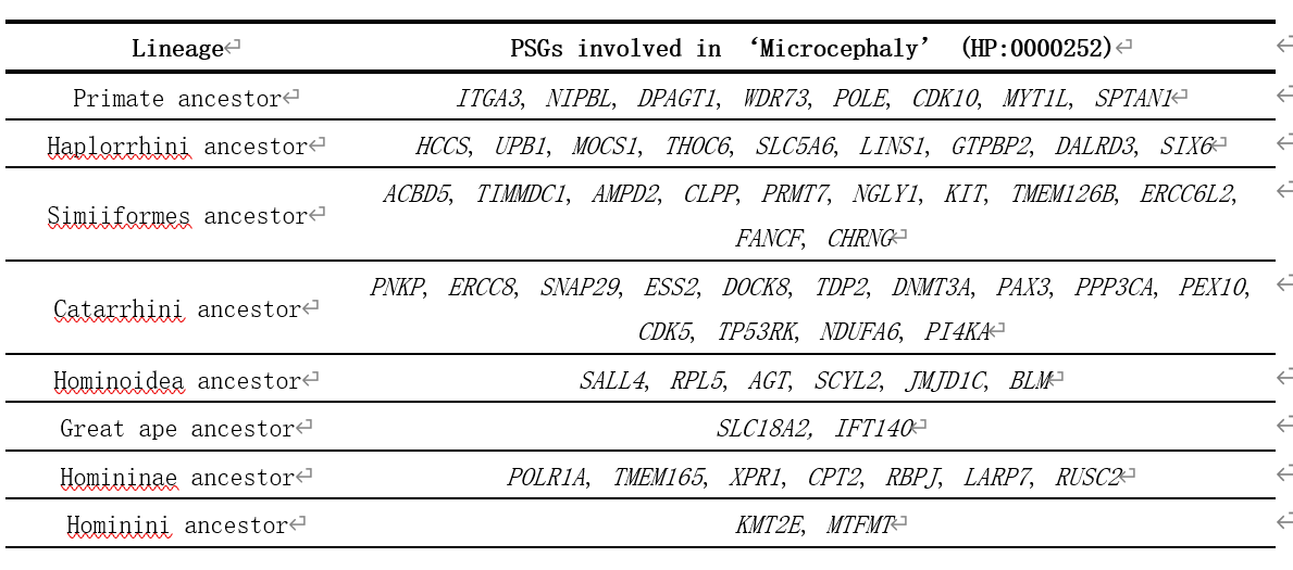 灵长类不同分支跟小头畸形相关的受到正选择的基因列表。张国捷课题组和吴东东课题组合作供图