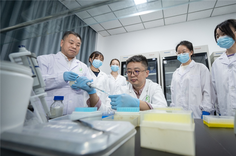Qi Xiaoguang (seated in the center), Li Baoguo (standing on the left) lead the research team in their investigations in the laboratory. [Photo provided to chinadaily.com.cn]