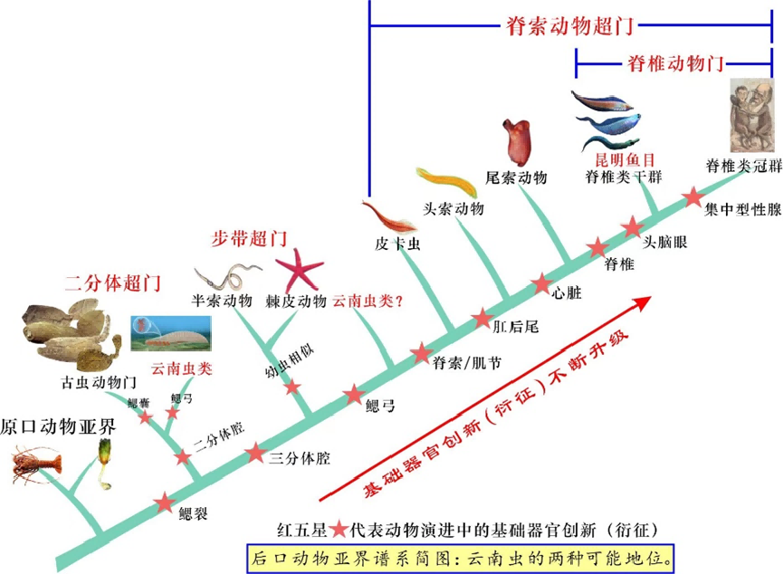 中科院院士、乐鱼网页版页面登录地质学系教授舒德干介绍,“在后口亚界谱系演进上,云南虫比脊椎动物至少低4个基础器官创新(衍征)等级(见上图)。目前脊椎动物已知唯一的干群是昆明鱼目,因为它已具有头脑眼、单鼻孔和嗅囊、原始脊椎、二分心脏、复杂肌节等无颌鱼必需的基本器官构造,所以与脊椎动物冠群的亲缘关系密切。”