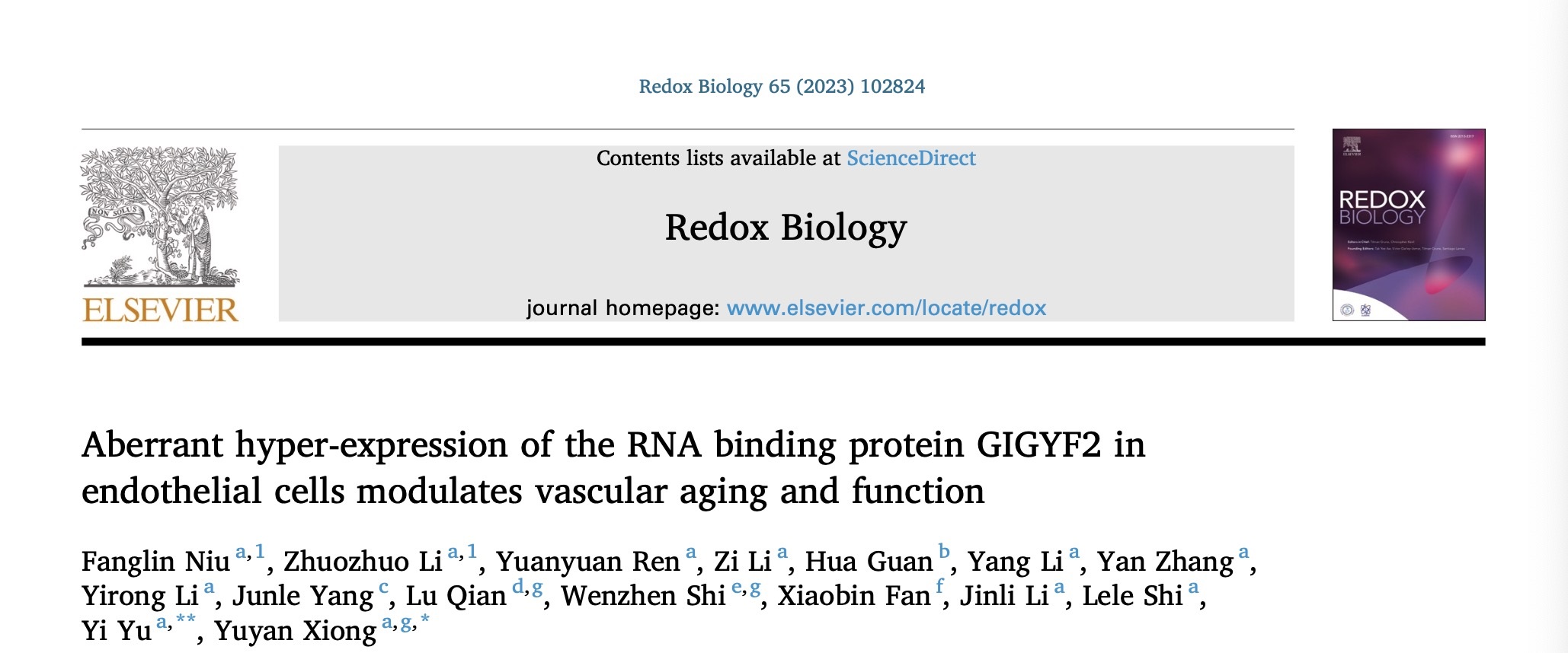 近日,乐鱼网页版页面登录生命科学与医学部熊裕焱教授团队在GIGYF2在血管内皮细胞衰老中的生物功能及其调控机制的研究中取得了新进展,研究结果发表在Redox Biology,题为“Aberrant hyper-expression of the RNA binding protein GIGYF2 in endothelial cells modulates vascular aging and function”。