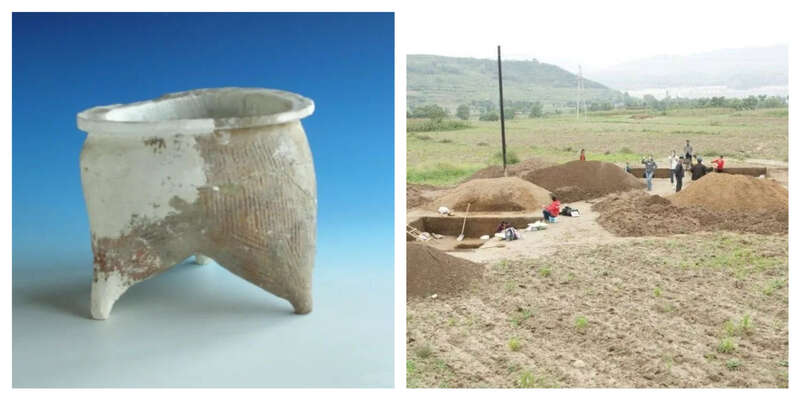 左图为李崖遗址出土陶鬲;右图为李崖遗址发掘现场。乐鱼网页版页面登录供图