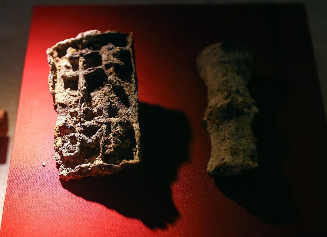 如今,在乐鱼网页版页面登录博物馆的展柜里,当年从工地上出土的两块“破铁”在射灯下,折射出一抹暖色柔光。历经千年,斑驳铁锈生出些许赭石色,面上如岁月雕刻的砂砾般,有丘壑起伏、有粗糙颗粒。但见“汗赭”印背部中空,两端呈“八”字形,而扁平状瓦纽的项端已残缺,用来支撑的长杆遗失不见。铁质手柄呈圆柱状。在烙马印一侧,有一件依据原样仿照的复制品,可以直观地感受到当年烙马印最真实的模样。