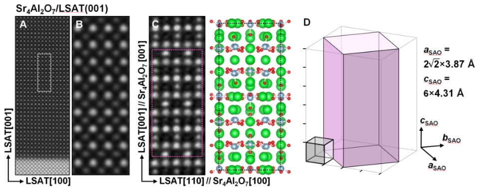 超四方相水溶性牺牲层Sr4Al2O7的晶体结构(A-C为Sr4Al2O7薄膜的高分辨透射电子显微图像和对应的晶体结构;D为Sr4Al2O7单胞与钙钛矿氧化物单胞的相对大小和外延生长关系)