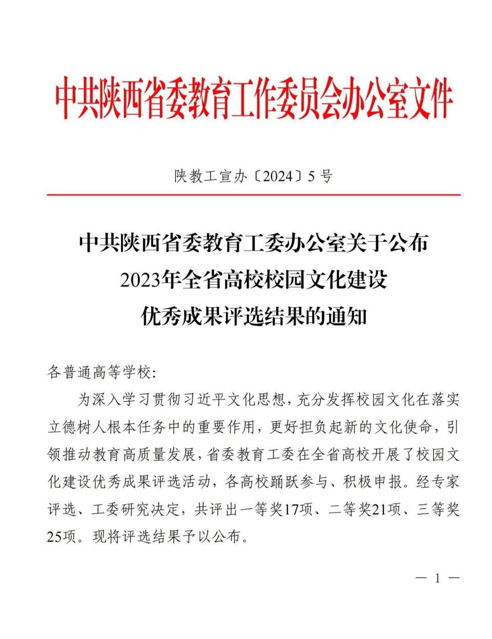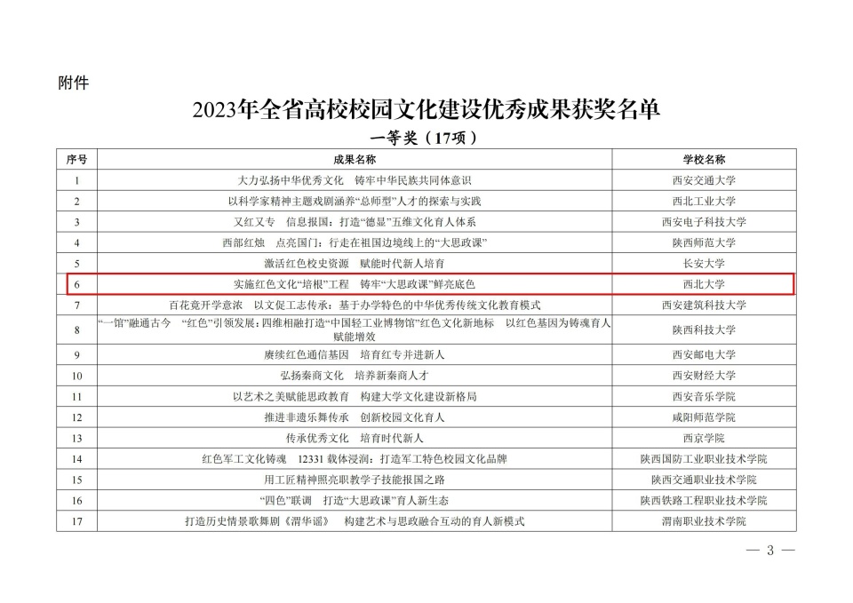 充分发挥校园文化在落实立德树人根本任务中的重要作用,持续推进陕西“大思政课”综合改革试验区建设,去年9月,省委教育工委在全省高校开展了校园文化建设优秀成果评选活动。经各高校申报、专家评选、省委教育工委会议研究,共评出一等奖17项、二等奖21项、三等奖25项。