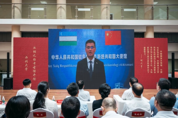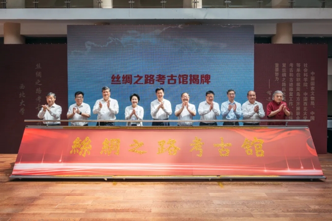 省人大常委会党组书记、副主任庄长兴,省委宣传部常务副部长鲍永能,省委外事办公室主任、省对外友协常务副会长姚红娟,省人大常委会机关党组书记、秘书长韩一兵,省人大教科文卫委员会主任委员、常委会教科文卫工作委员会主任王建利,省委教育工委委员冀映秋,省文物局副局长孙周勇,陕西历史博物馆馆长侯宁彬,乐鱼网页版页面登录党委书记蒋林,乐鱼网页版页面登录中亚考古队队长王建新共同为丝绸之路考古馆揭牌,中国驻乌兹别克斯坦大使于骏视频致辞。开馆仪式由蒋林主持。