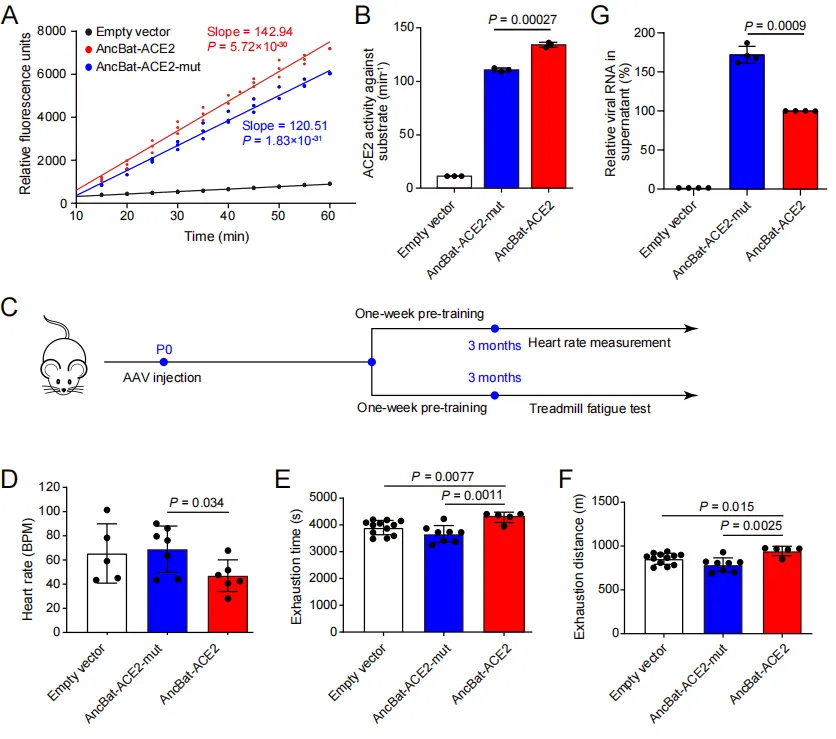 同时,研究团队进一步验证ACE2在蝙蝠祖先枝系上所受选择压力对心脏功能的影响,利用心脏特异表达的腺相关病毒(AAV9)分别将AncBat-ACE2和AncBat-ACE2-mut转染至小鼠心脏中,并对这些小鼠进行运动疲劳测试。发现携带AncBat-ACE2的小鼠比携带AncBat-ACE2-mut的小鼠的心率调节能力和运动能力都显著更强。