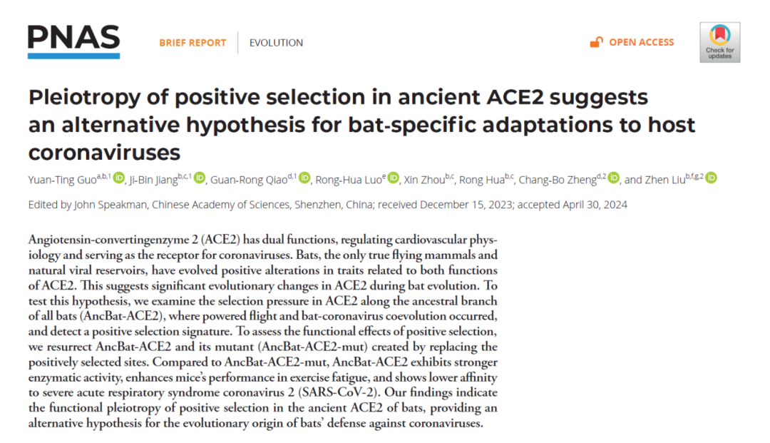 该研究成果近日以“Pleiotropy of positive selection in ancient ACE2 suggests an alternative hypothesis for bat-specific adaptations to host coronaviruses”为题发表在PNAS《美国科学院院报》期刊上。