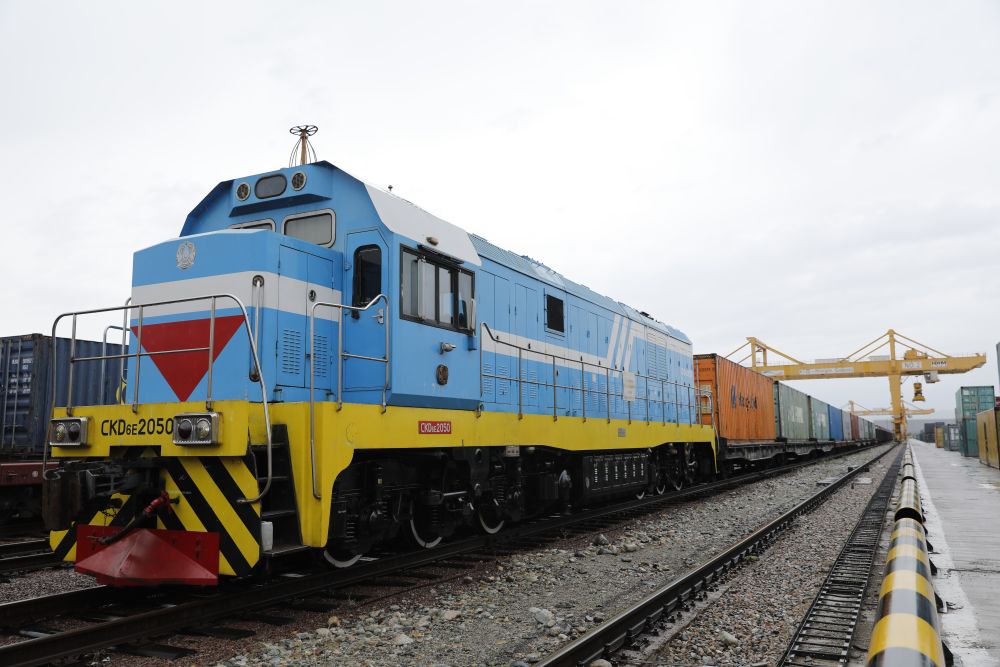 货运火车进入哈萨克斯坦南部中哈边境地区的“霍尔果斯-东大门”无水港。