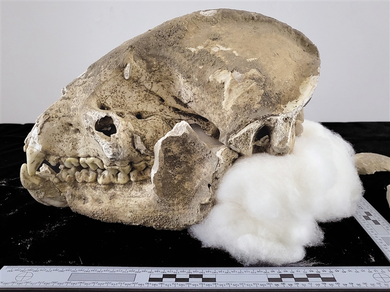 大熊猫头骨化石侧面。