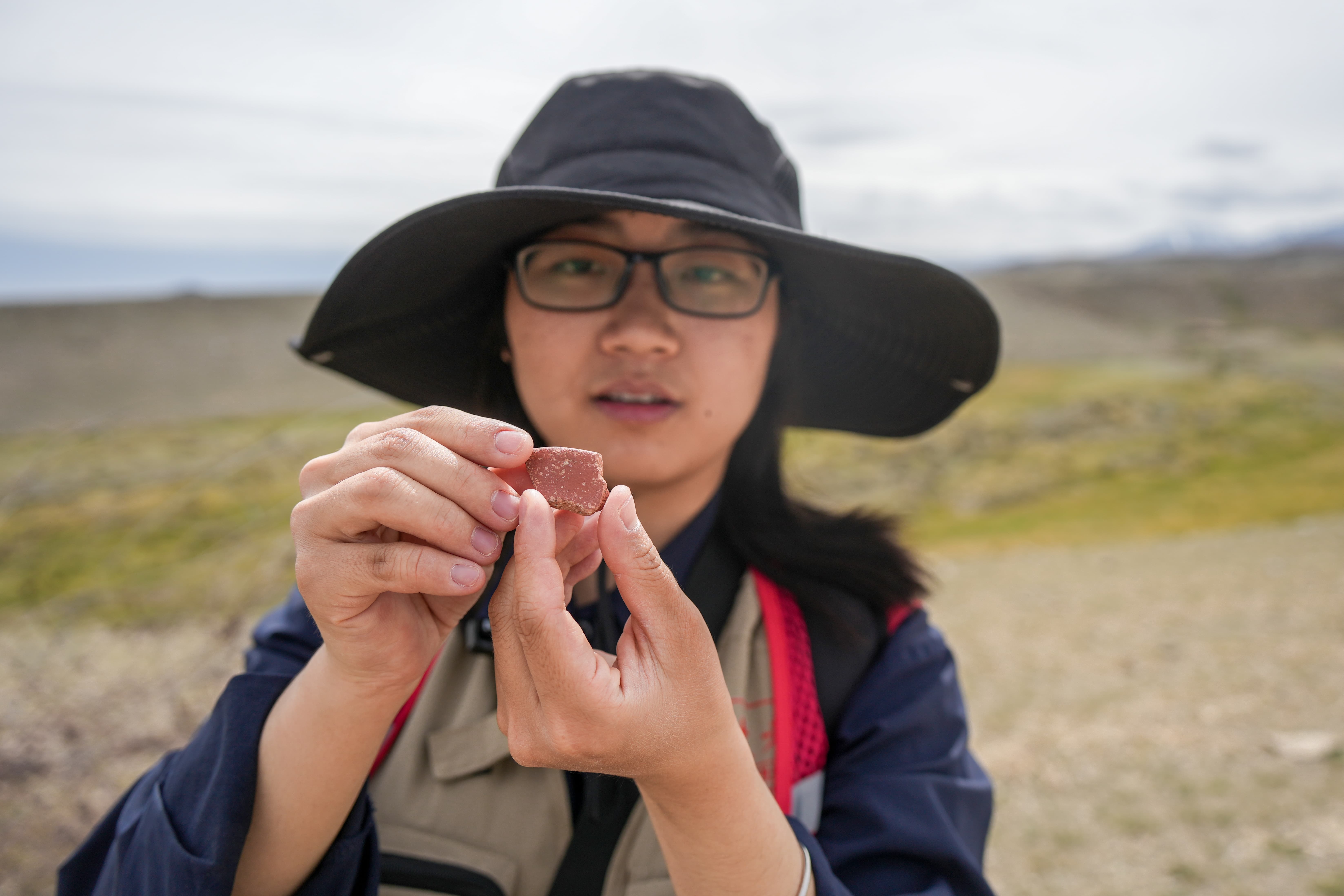 8月21日,伊吾县文物“四普”队员、乐鱼网页版页面登录文化遗产学院学生吴益展示发现的古代陶片。
