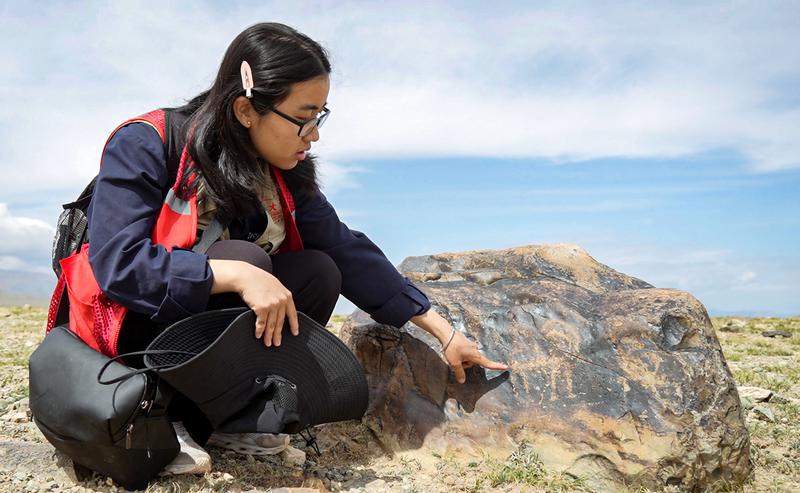 8月21日,伊吾县文物“四普”队员、乐鱼网页版页面登录文化遗产学院学生吴益展示发现的岩刻画。