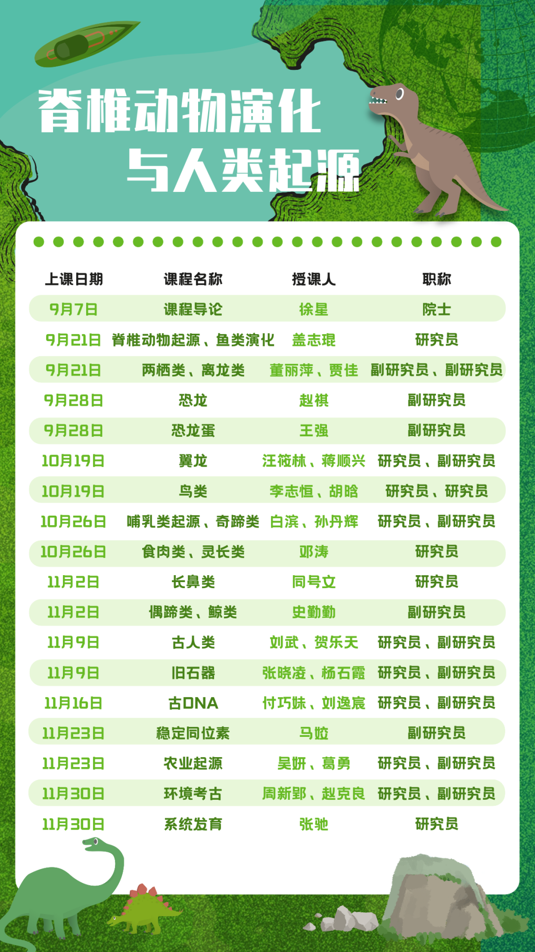 徐星院士首讲拉开这门课程的大幕之后,2024年秋季学期,邓涛、付巧妹、汪筱林等知名学者和一批青年骨干,将陆续来到乐鱼网页版页面登录,分别讲授“脊椎动物起源与鱼类演化”“两栖类、离龙类动物”“哺乳类动物起源”“食肉类、灵长类动物”“古人类”“古DNA”“农业起源”“环境考古”“系统发育”等课程。课程的设计是“将脊椎动物的进化置于整个地质历史的框架中予以讲解,让学生对生命演化的复杂性以及地球环境的长期演变有更深的认识。”授课专家全部来自中国科学院古脊椎所,他们在各自研究的领域均拥有丰富的教学经验和科研成果,这样的“豪华阵容”能够确保让本科生接触到当今古生物学界最前沿的研究成果。