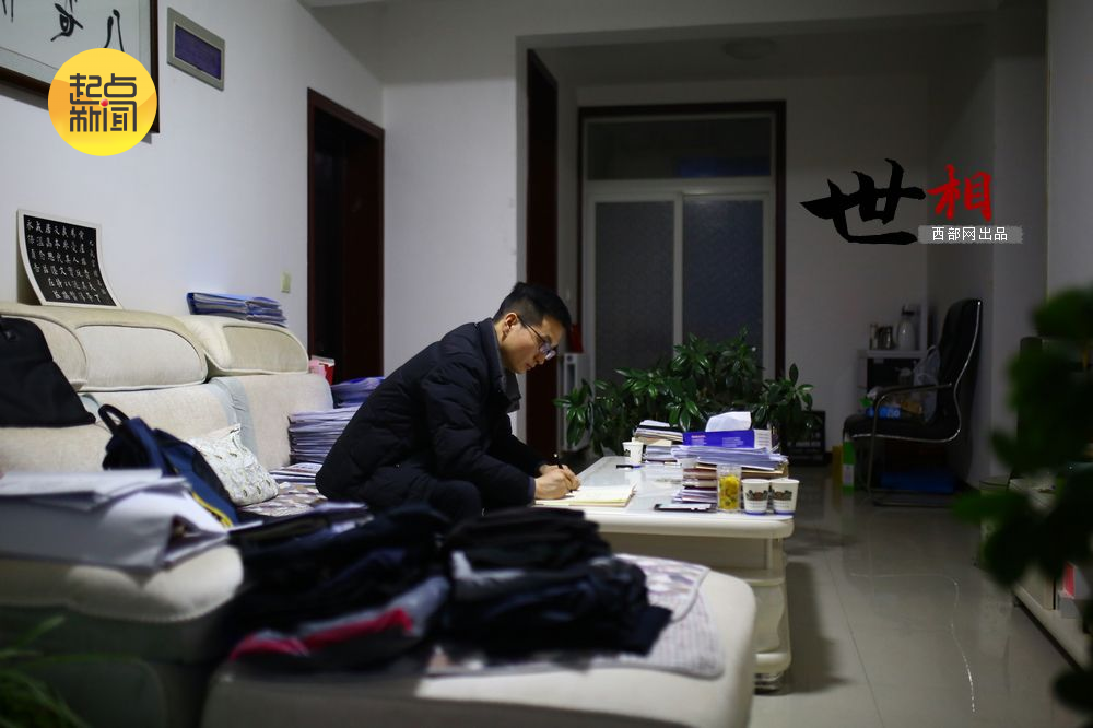 晚上七点,夜幕降临,下班后的办公楼里一片寂静。郑飞安排完次日的工作后,准备回家。“我这会儿感觉一点都不累,让我再开两个小时会我也没问题!”奔波了一天的郑飞仍然精神十足。他的住处与办公楼一墙之隔,一进门,映入眼帘的是沙发和茶几上堆满的文件。不大的客厅,像是郑飞的第二个办公室。“没收拾,有点乱。”郑飞略显局促地说。而偶尔从琐碎的工作抽离出来的郑飞,每周都会在这里伏案阅读和写作,于他而言,这是平和心境的最佳自处方式。